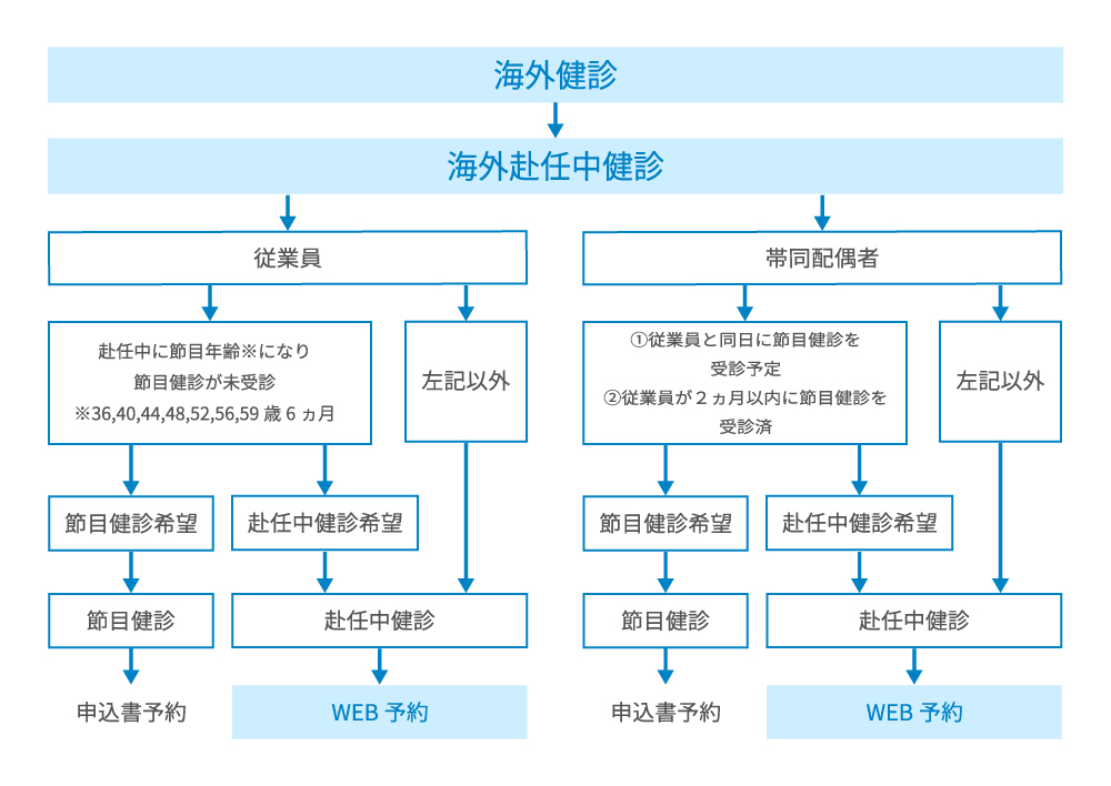 1,配偶者は赴任者本人と同日受診が基本ですが、やむを得ず受診日が遅れる場合は受診月+2ヶ月以内に受診してください。